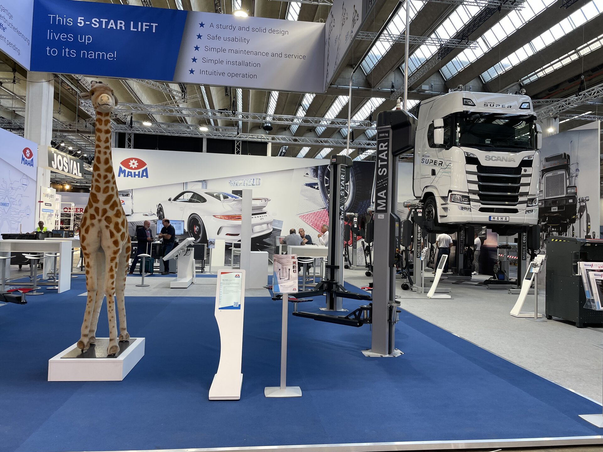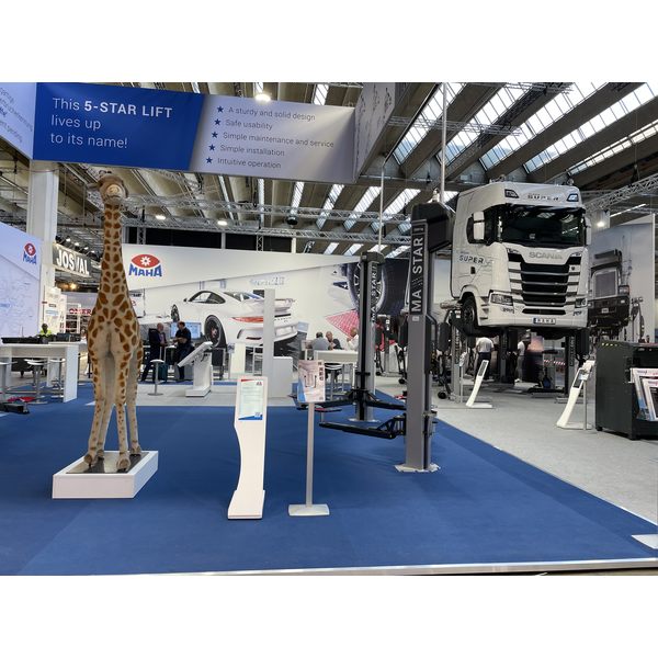 Auch der Star der Zwei-Säulen-Hebebühnen hatte seinen Auftritt auf der Messebühne – die MA STAR triple safety mit 3,5 t, 5,5 t und ganz neu mit 6,5 t Traglast. Die Fünf-Sterne-Hebebühne hebt sich durch ihr einzigartiges Design und vor allem ihre Sicherheit „triple safety“ hervor.