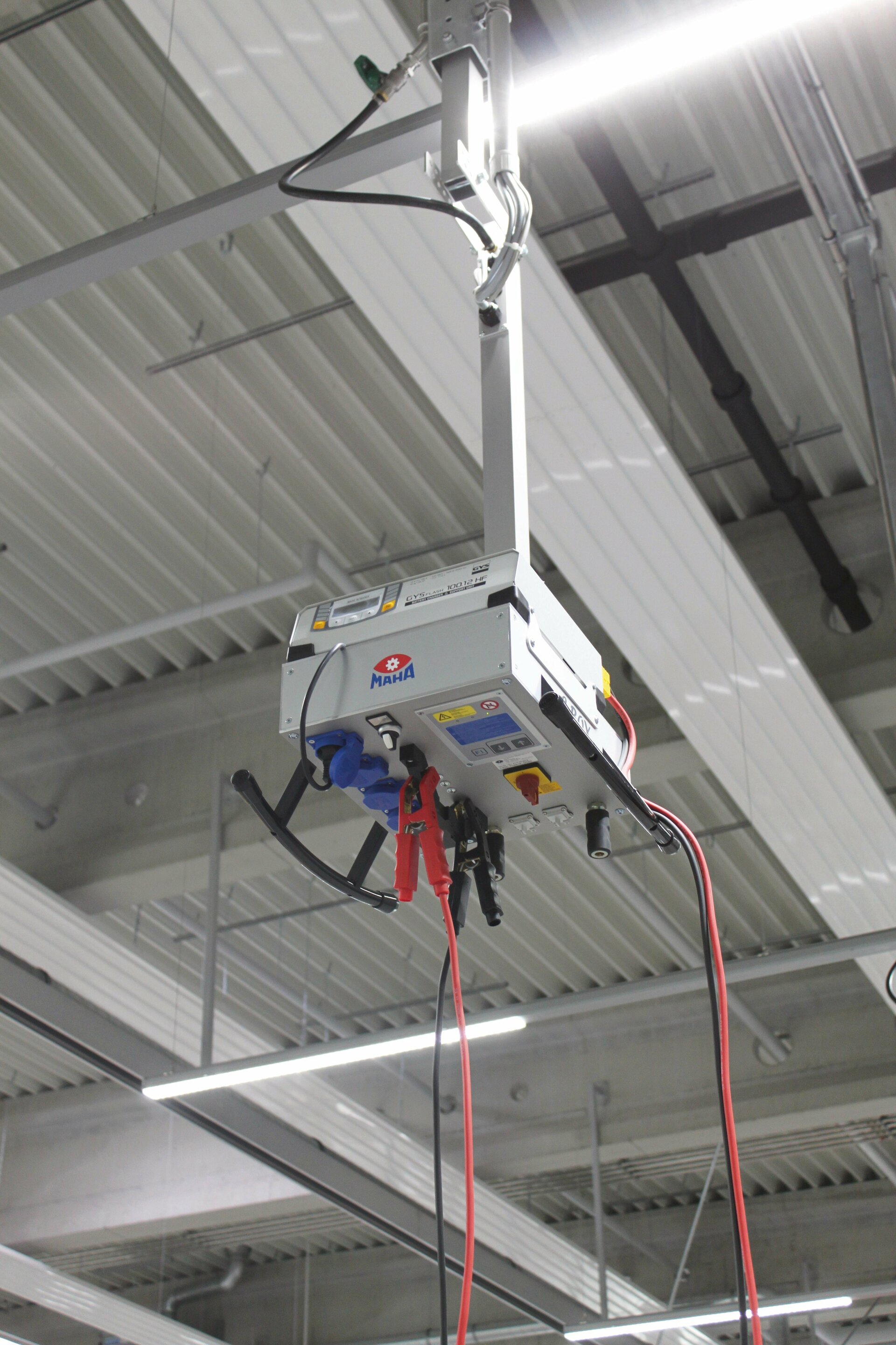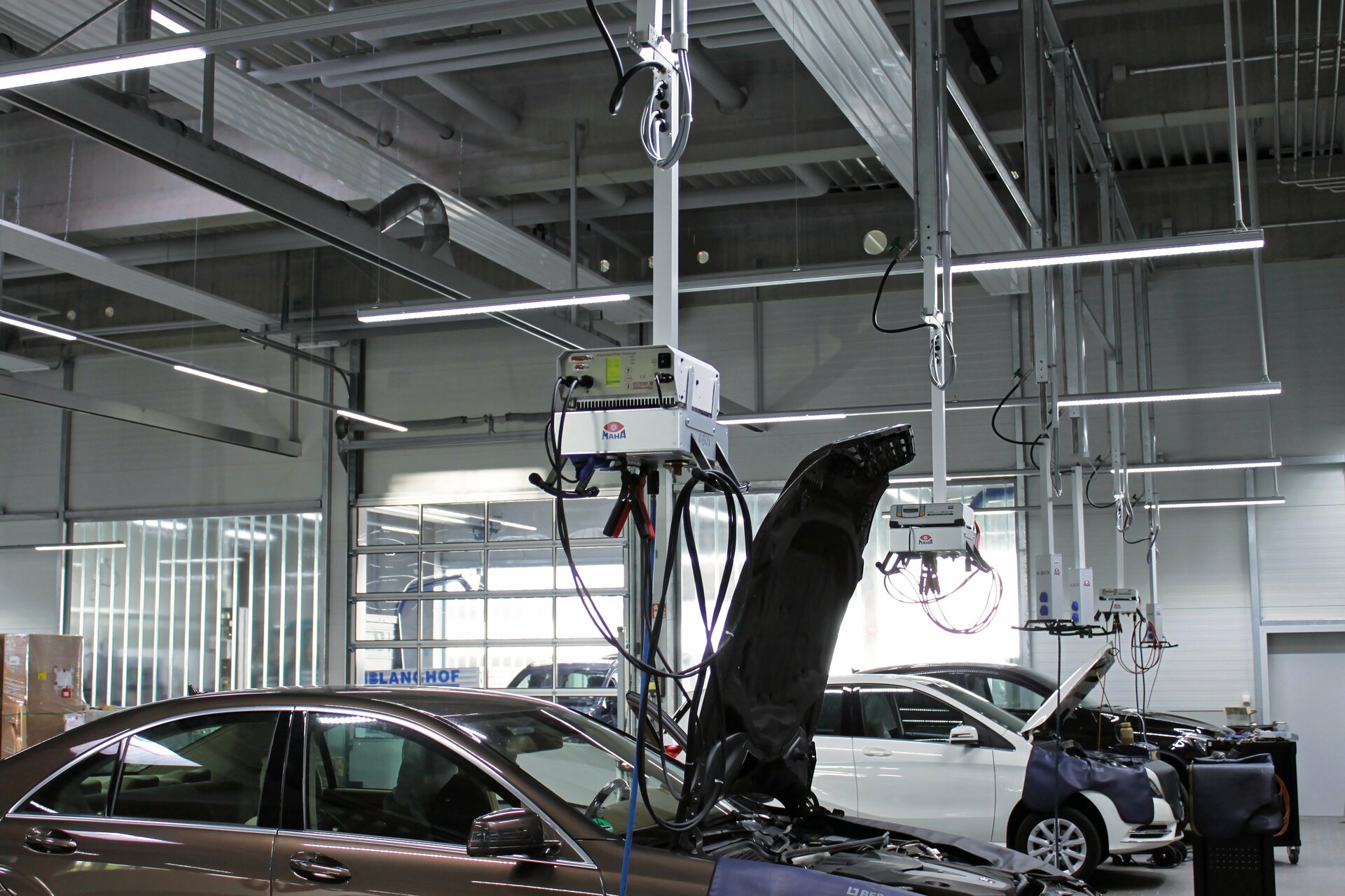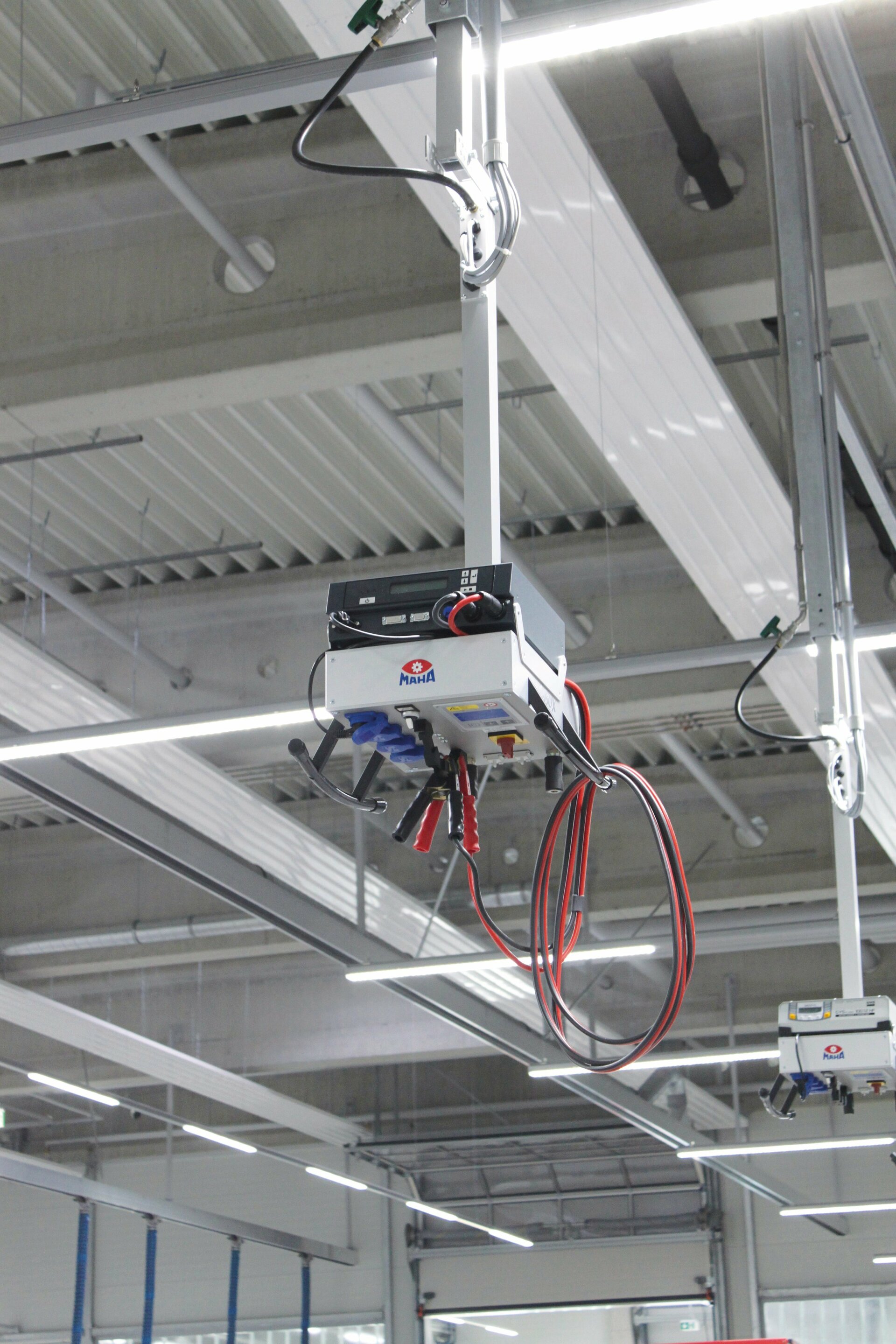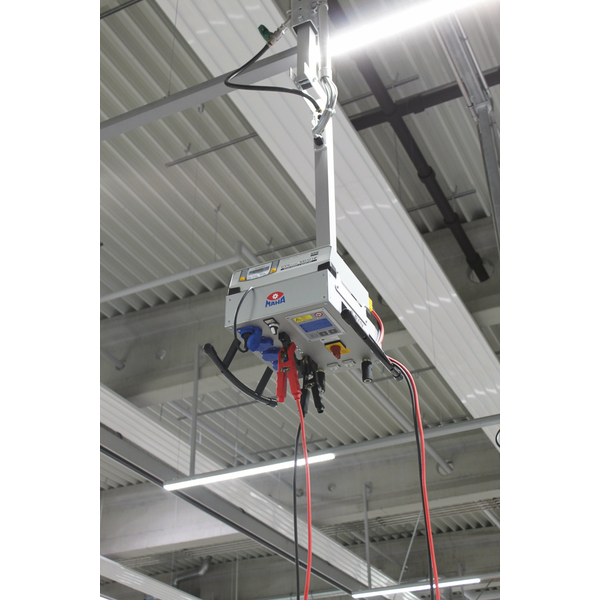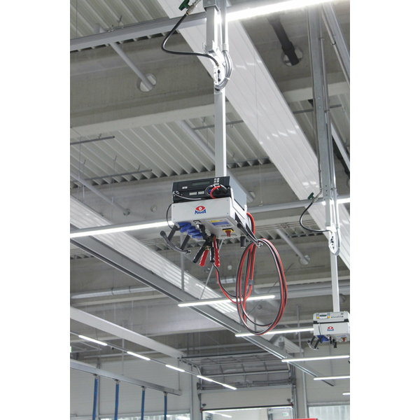 Für den optimalen Einsatz bietet die neue von der Decke hängende E-BOX neben Strom- und Druckluftversorgung, einer integrierten Steuerung für die Hebebühne und LAN-Kabelanschluss auch ein Ablagefach für Batterieladegeräte – eine praktische Kombination, die endlich das Energieversorgungsproblem direkt am Werkstattarbeitsplatz löst.