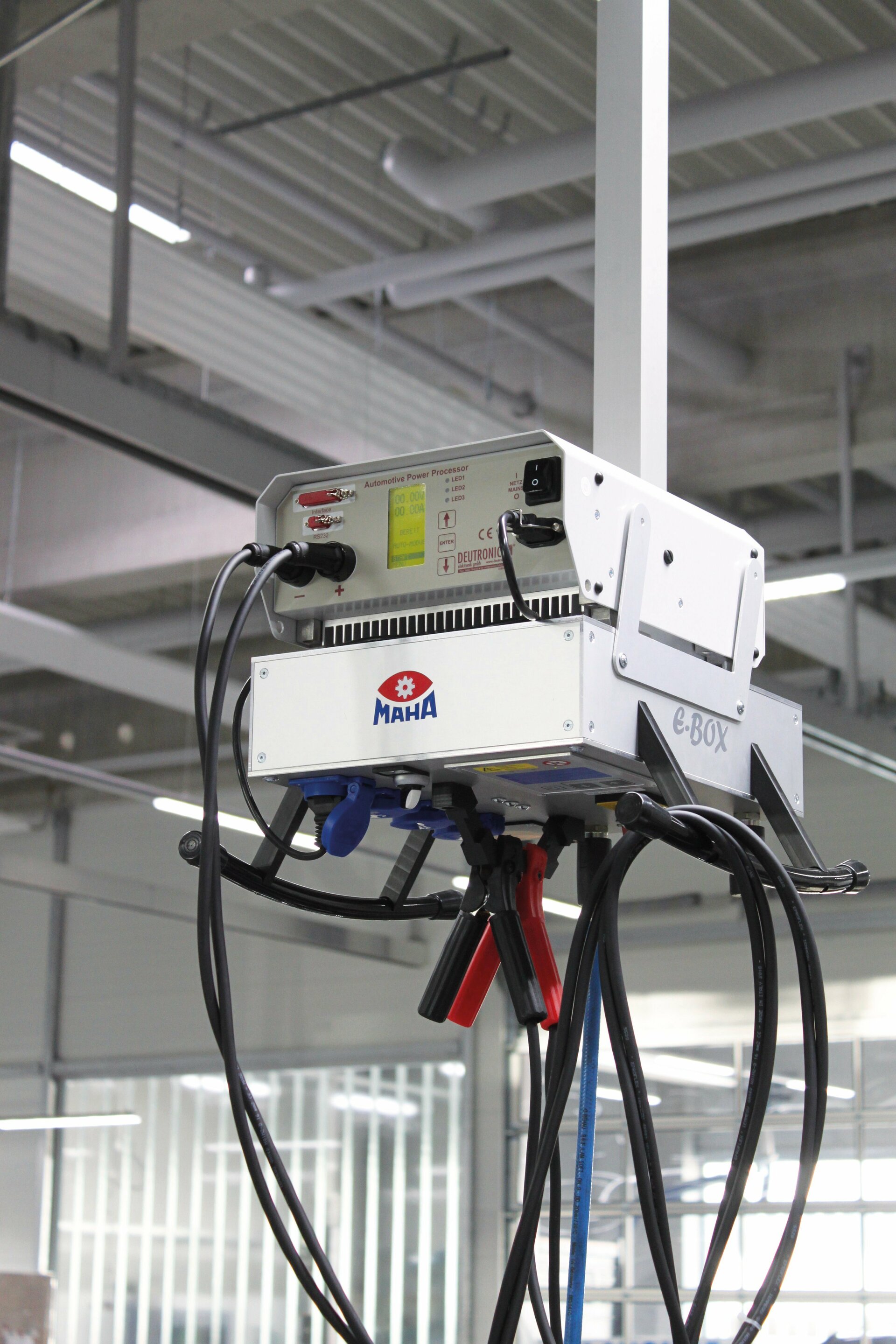 Haldenwang, 20. Dezember 2018. Mit der neuen E-BOX von MAHA gehören Stolpern, provisorisches Befestigen oder Beiseiteräumen angeschlossener Batterieladegeräte der Vergangenheit an. Auf einem eigenen Ablagefach fügen sich fast alle gängigen Ladegeräte ein und erfüllen praktisch verstaut ihren Zweck, ohne wie bisher im Weg zu sein. „Mit dieser Kombination bieten wir eine einzigartige Lösung für das Problem der Energieversorgung am Diagnose- und Service-Arbeitsplatz“, erklärt Holger Seeliger, Produktmanager des Allgäuer Herstellers, begeistert. „Der benötigte Ladestrom von rund 100 Ah, der von vielen Herstellern vorgegeben wird, ist jederzeit direkt beim Fahrzeug verfügbar und kommt dank der neuen E-BOX einfach und praktisch von oben.“ MAHA ist damit der erste Anbieter, der diesen Bedarf maßgeschneidert in einem Produkt integriert – ein idealer Ersatz für die klassische Energieampel in der Werkstatt, nicht zuletzt, da durch das nahe Aufhängen am Arbeitsplatz nur kurze Kabellängen für die jeweiligen Bearbeitungsmaschinen entstehen, die Durchgangswege somit nicht mehr blockieren.