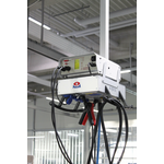 Standardmäßig bietet die neue E-BOX zwei Druckluftanschlüsse mit Sicherheitskupplungen, drei Steckdosen sowie optional zwei LAN-Steckdosen und neu nun auch die Möglichkeit, ein entsprechendes Ladegerät zu integrieren. Die Verkabelung verläuft anders als bei anderen Herstellern geschützt in einem robusten Vierkant-Aluminiumrohr in L-Form, das für Stabilität sorgt und Schwingungen vermeidet. Die Verkabelung mit 5 Metern Länge bis zur Hallendecke ist im Standardpreis bereits enthalten. Weiterhin sind alle Anschlüsse in der E-BOX werkseitig bereits verdrahtet. Optional kann zudem ein Anschluss zur Druckluftaufbereitung und eine Hebebühnensteuerung integriert werden.
