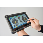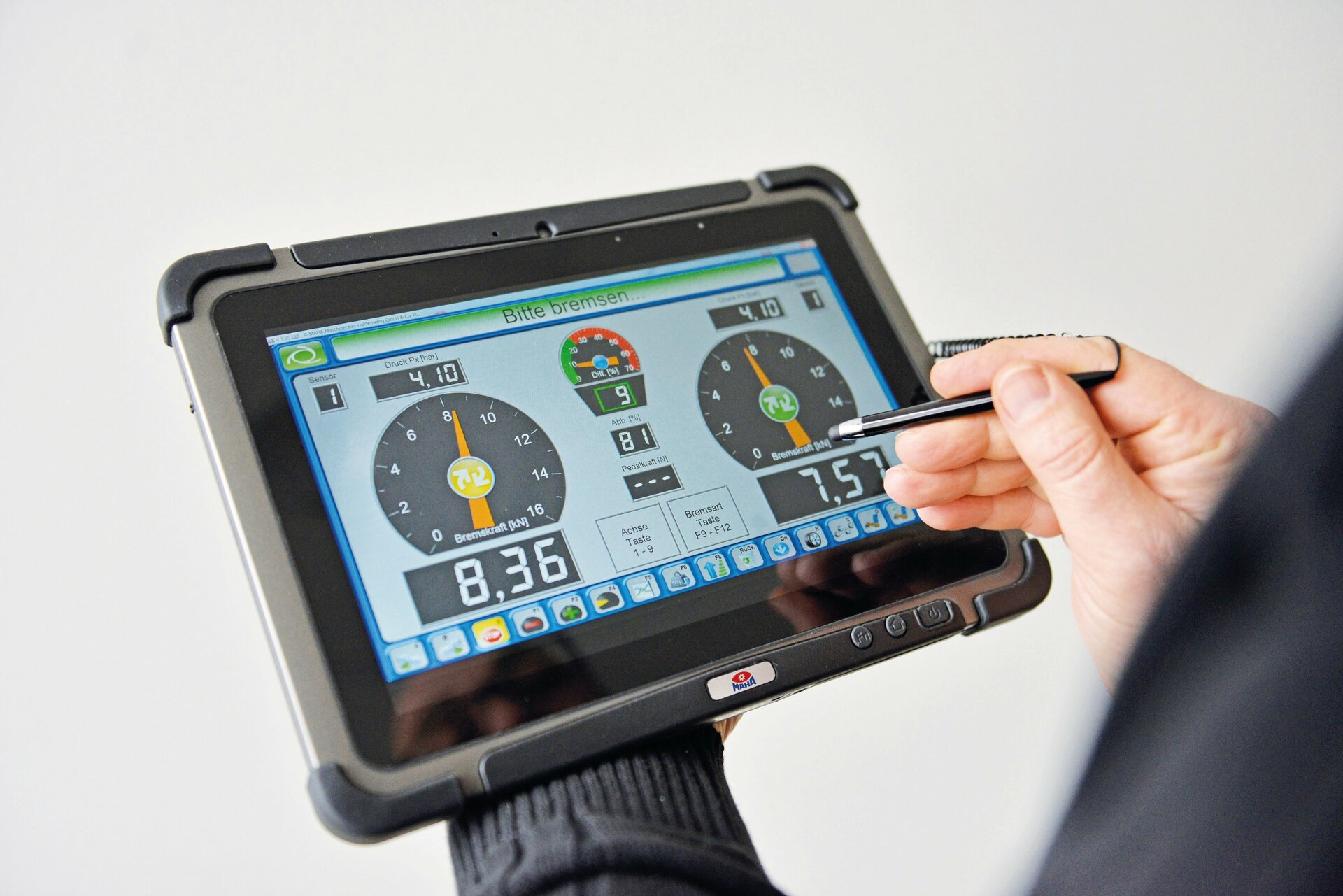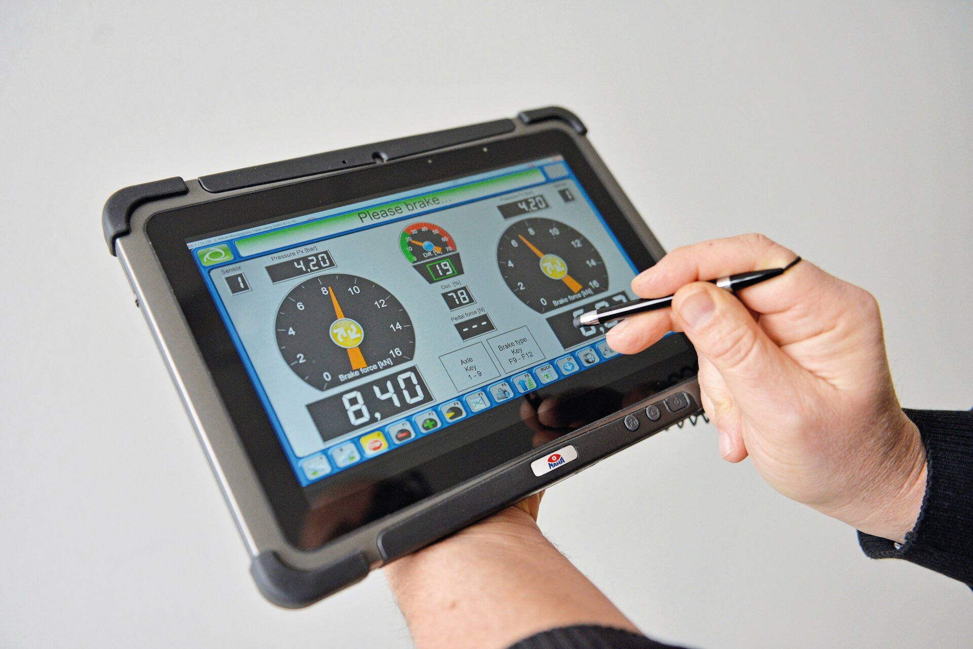 Mit dem kabellosen Touchscreen ist der Anwender nicht mehr an das Bedienpult gebunden, sondern kann alle Funktionen per Fernsteuerung völlig flexibel von jedem Ort innerhalb der Werkstatt starten und steuern. Das ist nicht nur praktisch, sondern spart Laufwege und somit viel Zeit: Bleibt der Prüfer während des Prüfvorgangs beispielsweise im Fahrzeug sitzen, sieht er auf dem handlichen 10,1"-Screen auf einen Blick die Ergebnisse. Die Bedienung erfolgt über das Multi-Touch-LCD-Display mittels Remote Control. Die Ansicht ist dabei 1:1 dieselbe wie an der Bedienstation. Im Anschluss werden die Messergebnisse automatisch über WLAN bzw. Bluetooth 4.1 übertragen. Eine Anbindung an andere Softwares, die in der Werkstatt eingesetzt werden, ist selbstverständlich ebenfalls möglich, sofern diese die Darstellung und Bedienbarkeit mittels Tablet erlauben.