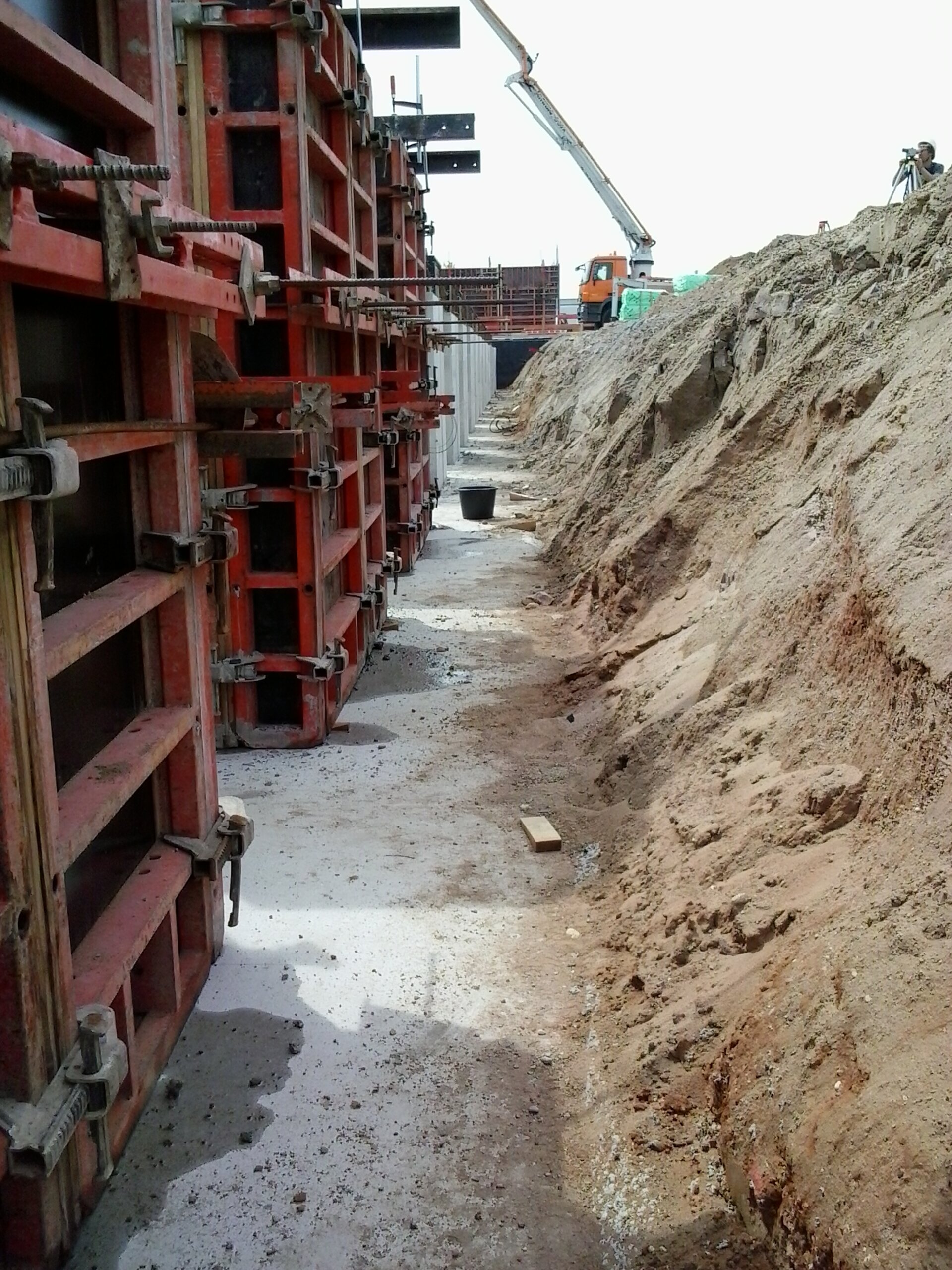 Im Anschluss wurden sie mit einem Geometer millimetergenau ausgerichtet und die Köcher Schritt für Schritt betoniert. Insgesamt wurden auf diese Weise 26 Kassetten exakt positioniert und in die richtige Höhe gebracht. Nachdem die Köcher gezogen wurden, konnten die Fundamente letztlich mit Sand angefüllt und der Werkstattbereich um die Kassetten herum gebaut werden.