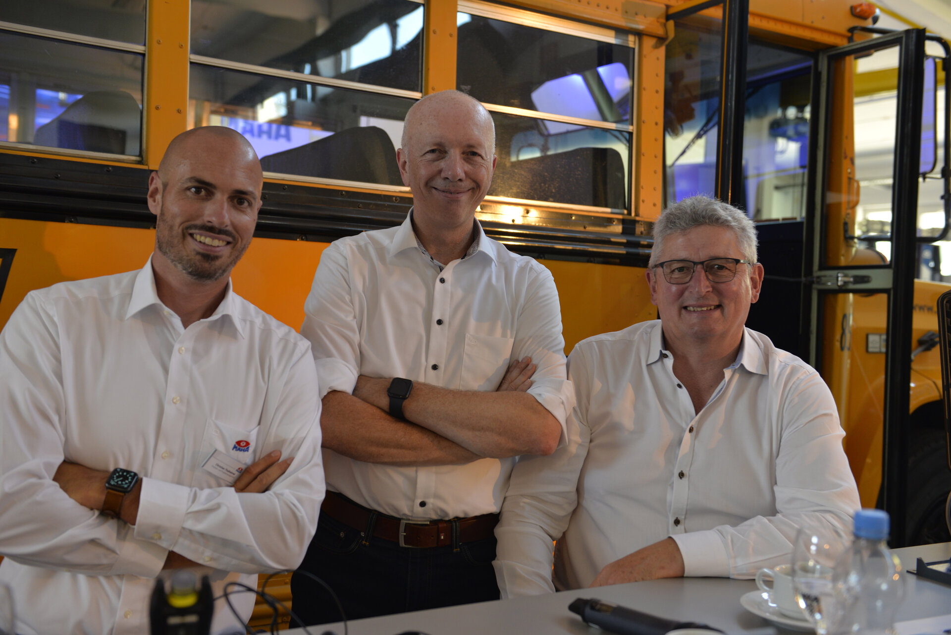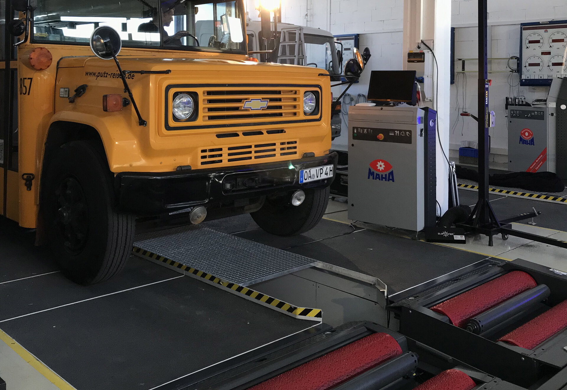 The latest product from MAHA was presented to more than 100 live participants at the MAHA Training Center in Haldenwang on 30 June 2022. For all those invited who were unable to travel in person, there was the option of joining the event digitally. More than 200 online participants took advantage of this opportunity. In total, partners, customers, friends and trade press from over 35 countries followed the unique bilingual event. After the theoretical part of the product launch, the black curtain fell, revealing under fog the star of the day: the CONNECT TRUCK with a yellow US school bus standing for inspection. This allowed the participants to convince themselves personally and virtually of the "10 out of 10 product advantages" that make a compelling case for the purchase of a CONNECT brake tester.