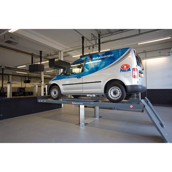 - Optional conversion to chassis measurement lift with precisely aligned driving platforms, sliding plates for tension-free wheel support, driving platform levelling and axle measurement supports